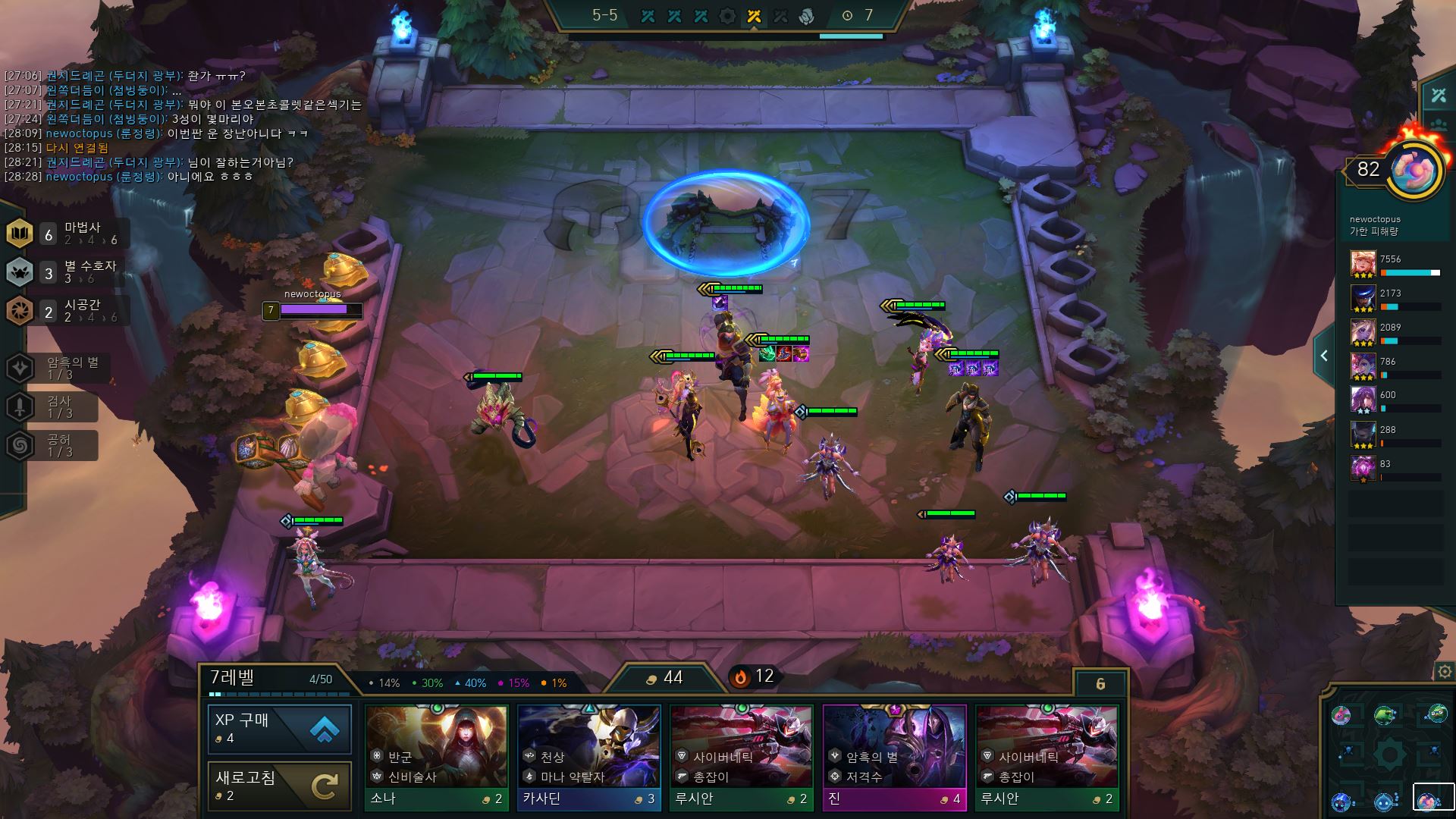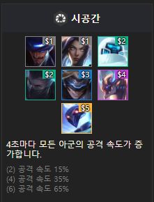 6챔피언이 3성을 만들어 진행을 하였으며 이번에는 시공간 시너지를 조금 썩어 사용하였습니다.
