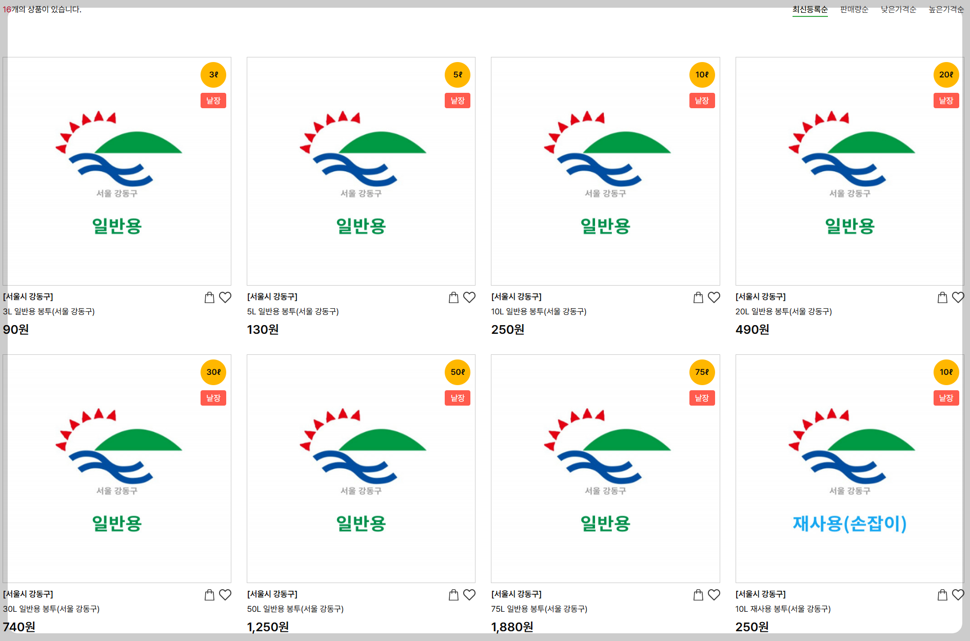 상품(쓰레기 종량제봉투)이 등록이 안된
