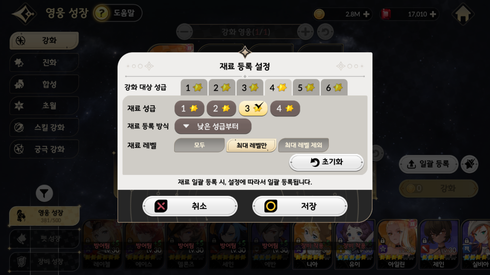 이렇게 두 단계 아래인 영웅을 강화 재료로
