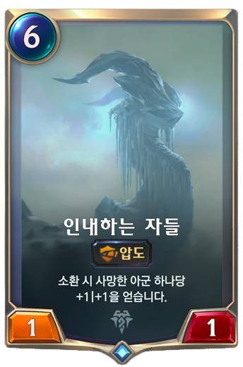 인내하는 자들 추종자는 여러 거미들과 약한 추종자들을 이용하여 스택을 많이 올려 강력해지고 압도 효과로 상대 넥서스를 공격하거나 극악무도 카드와 연계하여 상대 넥서스를 공격할 수 있습니다.