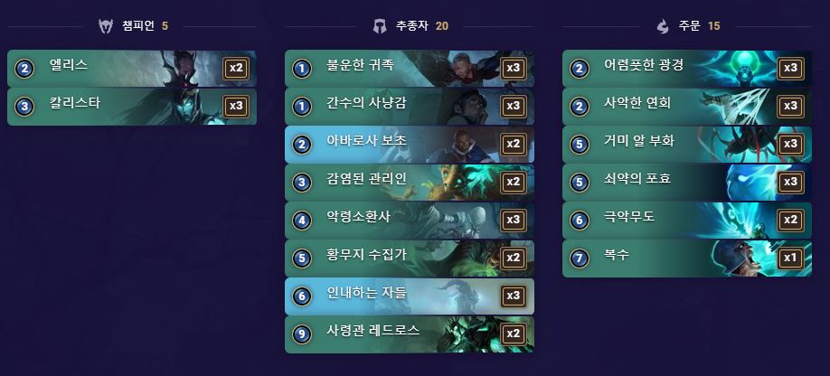 기본적으로 인내하는자덱은 엘리스(+거미)와 칼리스타를 이용하여 초중반을 빠르고 안전하게 운영하며 후반에 인내하는 자 + 극악무도로 마무리하는 그런 덱입니다.
