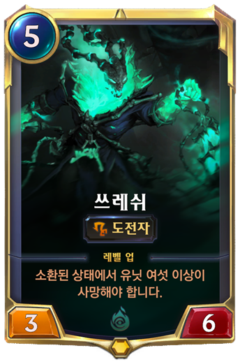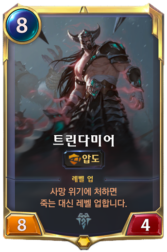 쓰레쉬도 칼리스타와 비슷하게 레벨업을 진행할 수 있으며 트린다미어는 압도 키워드를 가지고 있어 후반에 상대 넥서스에 대미지를 강력하게 줄 수 있습니다.