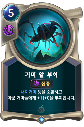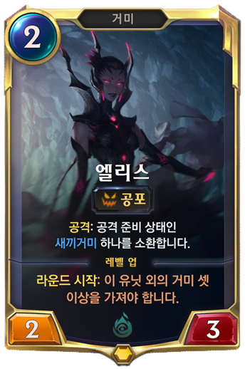 엘리스는 공격할 때 새끼거미를 소환해주어 인내하는자 스택을 조금 더 빠르게 올릴 수 있게 도와주며 렙업을 진행했다면 도전자 키워드가 생겨 못 잡았던 포착 불가 추종자를 잡거나 원하는 상대를 잡을 수 있어 너무 좋은 카드입니다.