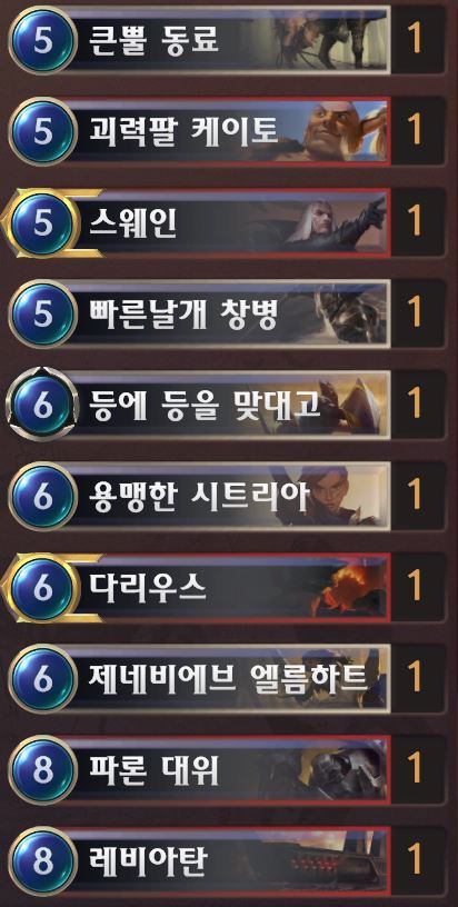 스웨인과 가렌은 중후반에 나와 역전을 시킬 수 있게 도와주는 카드들로 빨리 렙업을 진행해서 이길 수 있도록 노력하는 것이 좋습니다.