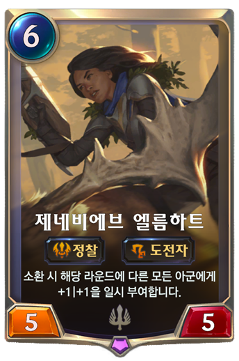 제네비에브 엘름하트는 뒤에서 나오지 않고 효과만 발동시키는 카드들을 자르기 위해서 사용하고 있으며 소환시 해당 라운드에 다른 모든 아군에게 버프를 주어 너무 좋은 카드입니다.