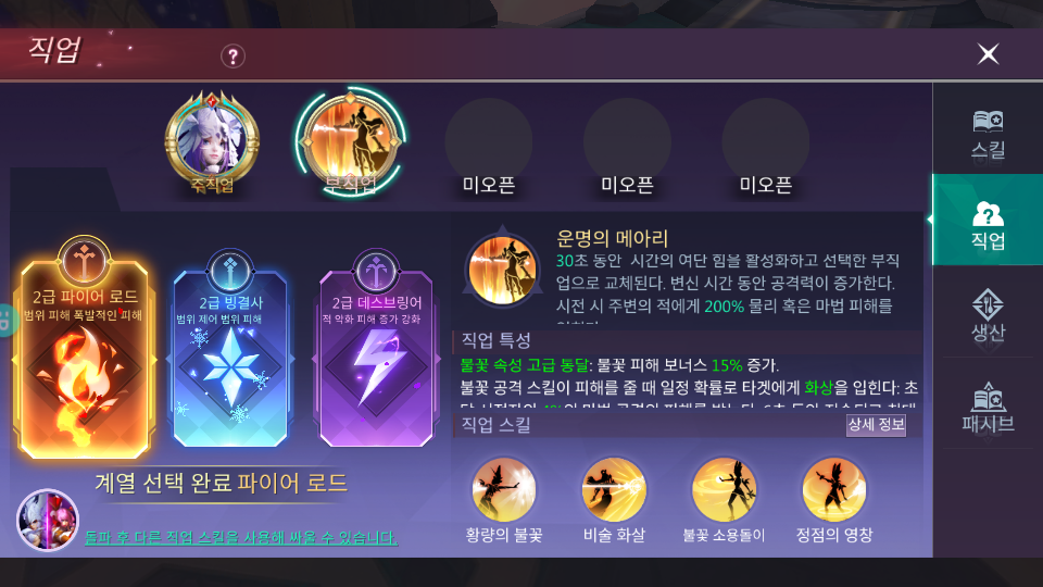 필자가 3가지 부직업을 선택해보고 사용해본 결과 개인적으로 가장 좋은 직업은 사진에 나와있듯이 불 계열이었습니다.