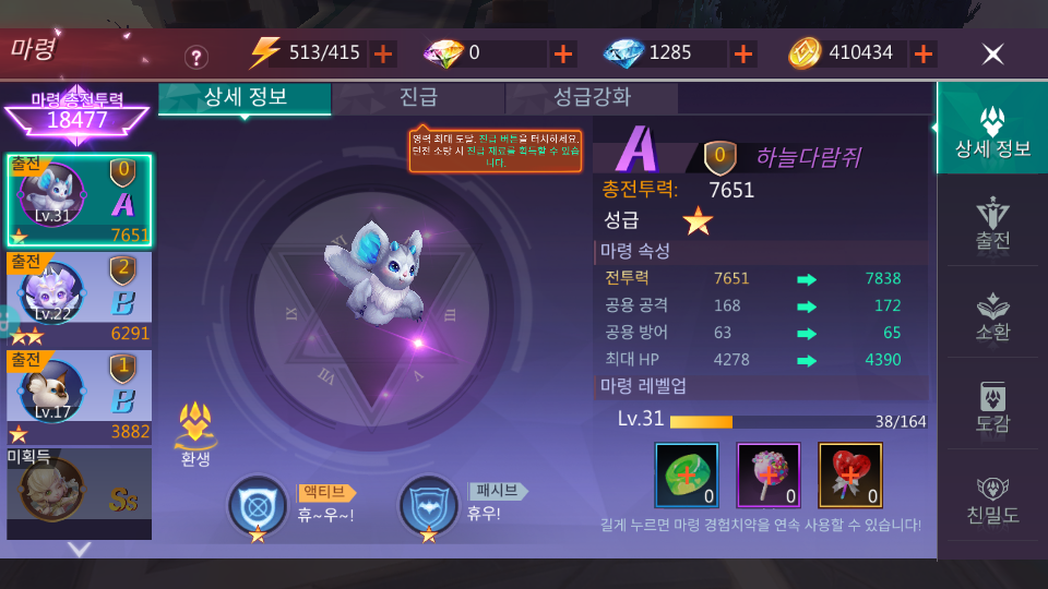 전투력 올리는 방법 중에 마령이 생각보다 쉽게 올릴 수 있는 방법중 하나입니다. 마령을 얻으면 얻을수록 도감으로 전투력을 올릴 수 있으며 경험치 캔디도 얻기 쉬운 편이라 마령을 계속 렙업도 진행할 수 있습니다.
