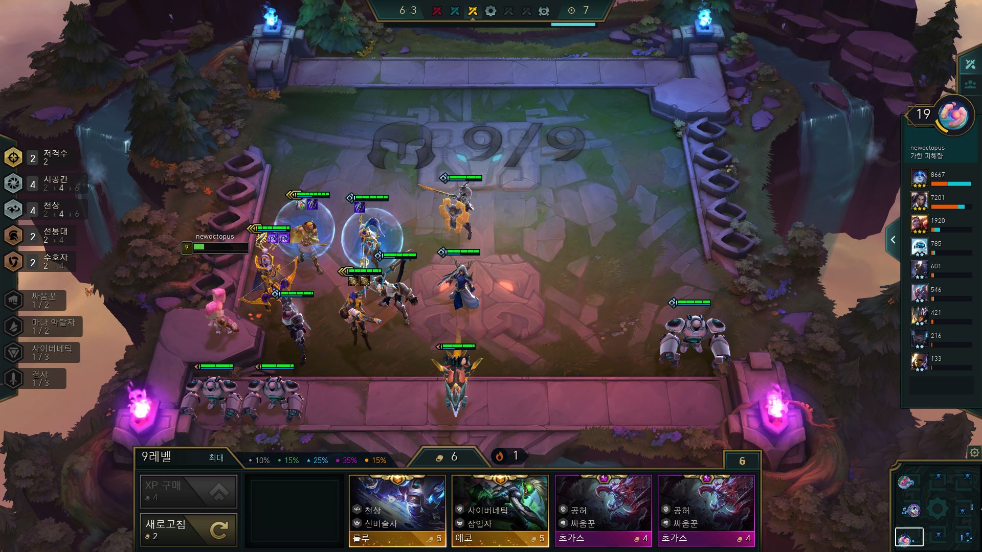 위 사진이 시너지 조합을 완성한 모습입니다. 9렙이라 조금 어렵겠지만 완성만 한다면 거의 다 이길거라 생각을 합니다.